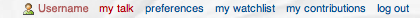 The user links are displayed at the top far right of the article (if using the default MonoBook skin). These tabs allow the logged-in user to view and edit their user page and wiki preferences. Additionally, the user links allow the user to quickly access their contributions to the wiki and logout.