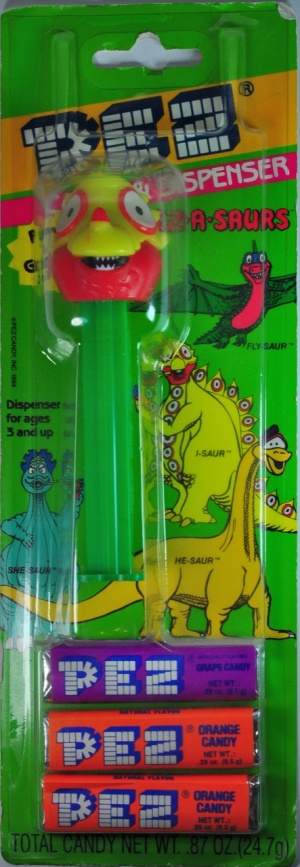 I-Saur is a dinosaur Pez dispenser in the Pez-A-Saur series. In Europe, he is known as "Titus."