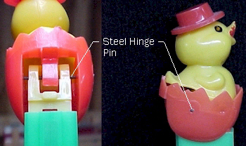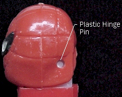 On newer dispensers, the head is attached to the inner sleeve by two plastic pins molded on each outer side of the inner sleeve. This allows the head to hinge on the inner sleeve. These pins are actually more of a spud or nub than a "pin". Unlike the steel pin that went all the way through the head and inner sleeve, the plastic pins allows the head to "pop" onto the inner sleeve and hold it in place. |