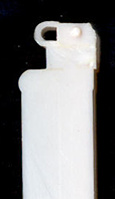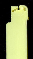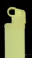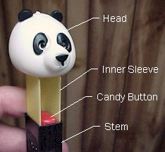 The Inner Sleeve acts as a candy "tray" for the PEZ candy. The inner sleeve is attached to the head with a metal or plastic hinge pin, and goes inside of the stem. Like the stem, the inner sleeve comes in many different colors and styles, dependent upon the age of the PEZ. Shown below are various styles of inner sleeves.