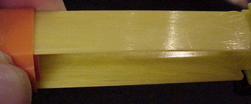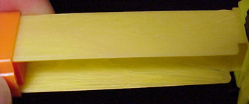 Marbleized Inner Sleeve - On older dispensers sometimes the inner sleeve is not molded in a solid color, but instead the plastic is "marbleized" with two different colors of plastic. Usually, the second color is a whitish color. This probably occurred because of a couple of reasons. The first possibility is that maybe the PEZ molding plant used some "filler" plastic pellets, and blended the filler in with the base color of plastic. Since colored plastic is bit more expensive than white or clear, using a filler color would allow the quantity of colored plastic to stretch farther. The second possibility is that this also occurred when PEZ changed colors when preparing to mold the next colored batch of inner sleeves. It would be easier and faster to dump the next color of plastic pellets into the infeed hopper on the injection molding machine than what it would be to thoroughly clean out all of the *old* color. With two different colors in the hopper, you would get a marbleized color in the plastic as one color runs out and the next color begins. Since the inner sleeves are an internal piece, there would be no reason to make sure that the inner sleeve color is *pure*, from a quality and appearance standpoint. In either case... the results are some very COOL looking inner sleeves! In the pictures below, you can see a marbleized inner sleeve. Keep in mind that the marbleizing is much more pronounced when looking at an actual sleeve (I found that it is a bit difficult to get a good picture of the actual effect).