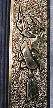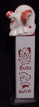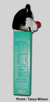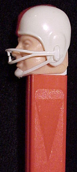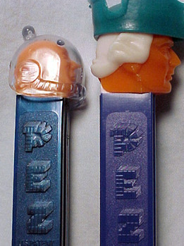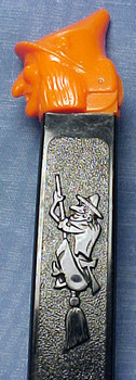 Embossed stems are stems that have other non-standard features or wording molded onto the stem. In the photo on the left, instead of having the standard PEZ logo this stem has the words "Cocoa - Marsh" molded on the stem. This dispenser is called a Cocoa - Marsh Spaceman and was a Premium that was taped onto the outside of a jar of Cocoa - Marsh Cocoa. The picture on the right shows a pennant that PEZ embossed onto the side of the Football Player's stem. This pennant provided a spot location for a Pennant sticker that was on an insert supplied with this dispenser. The purpose of the sticker was for kids to write the name of their favorite team onto the pennant, then affix the sticker onto the stem. Quite a clever idea... it allowed PEZ to supply a *generic* Football Player that could be *customized* into any kids favorite team! Another type of Embossed Stem was on the Witch A dispenser shown below.