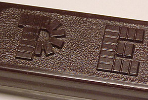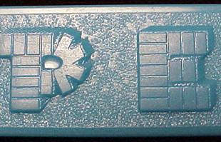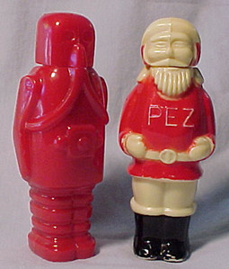 produced the dispenser on the right called a Silver Glow dispenser. Shadowed and Non-Shadowed PEZ Logos - "Shadowed" PEZ logos on a stem refers to the molded relief coming off from one side of the letters. This relief gives each letter a more 3-D appearance by having a cast "shadow" coming off each letter.