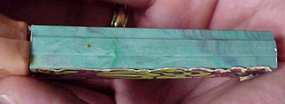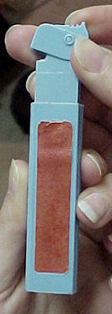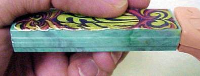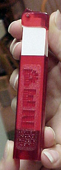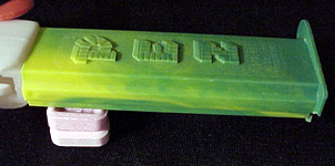 On other dispensers, the marbleizing was purely by accident. The marbleizing would occur when PEZ changed colors as they were preparing to mold the next colored batch of stems, and they did not get all of the *old* color of plastic pellets removed from the infeed hopper on the injection molding machine. With two different colors in the hopper, you would get a marbleized effect in the plastic as one color runs out and the next color begins. Since this marbleizing is not intentional, the stem would be considered a "reject" and trashed. Sometimes, however, one of these "reject" stems would not be caught, and would be assembled into a complete dispenser. These marbleized stemmed dispensers are very unique and hard to find! Shown below is one of these stems from our collection.