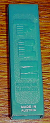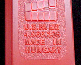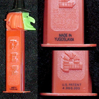 A Stenciled Stem is a stem that has the *Made in* and the Patent number information stenciled onto the sides of the stem. Although is it not verified by PEZ, stenciled stems are believed to have been made during the transition period from the 3.9 to 4.9 patent numbers. It is guessed that PEZ had a surplus of molded 3.9 patent stems when the new 4.9 patent number was issued. Instead of discarding the discontinued stems, PEZ printed the new patent number (4.9) onto the outside of the molded 3.9 stem. On all of the stenciled stems, the Made in <Country of Origin> info is printed on one side, with the new patent number printed on the opposite side of the stem. Stenciled stems are more readily found on 3-Piece Witches and typically are printed in black... although white stenciled stems do exist. Shown below is the only example of a White Stenciled Stem that I have ever seen. This wonderful dispenser is owned by Tanya Wilson.