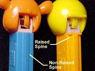 The Spine is the *track* that is centered longways down the stem on both the front and back sides. On older non-footed dispensers, the spine sticks out just a small bit. On footed dispensers, this spine is raised out even further and is very pronounced. In the photo above, the differences between the older Non-Raised Spine and the newer Raised Spine can be clearly seen. Also